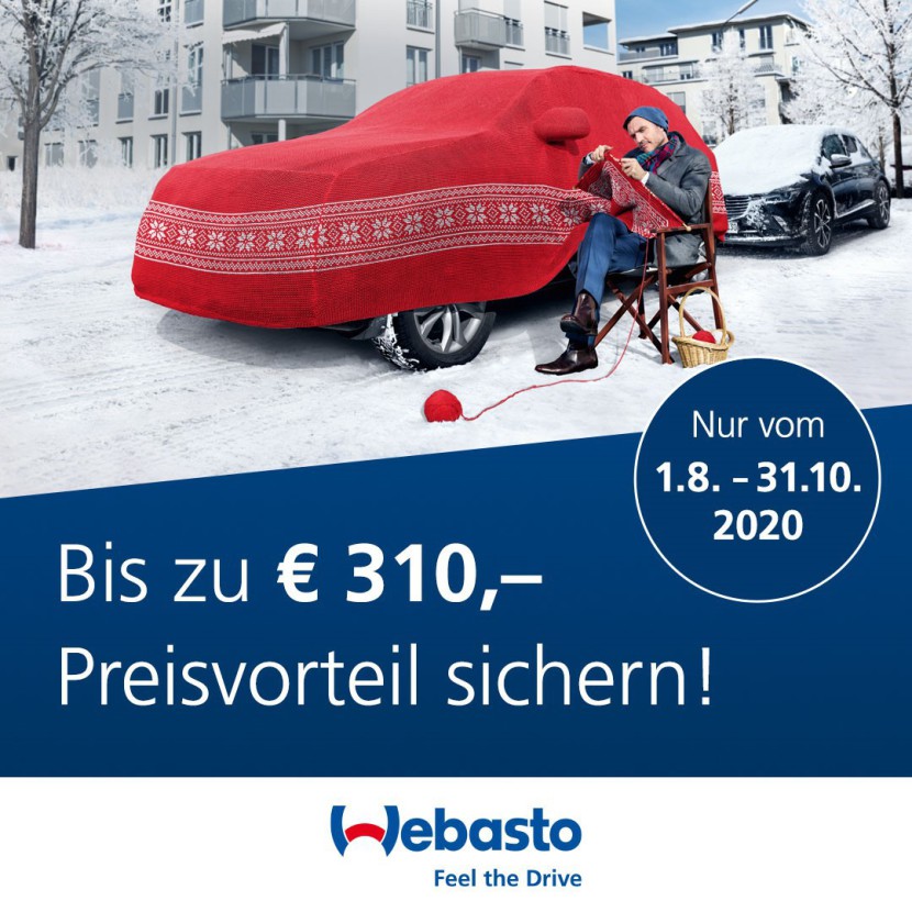 * Aktionszeitraum vom 01.08. – 31.10.2020. Der Preisvorteil gilt nur für Endkunden beim Kauf einer Webasto Thermo Top oder Webasto Air Top inklusive Bedienelement und Einbau, auch für Autohauskooperationen. Gilt nicht für Flottenkunden, die eThermo Top Eco und Aufrüstungen von OE-Geräten. Der Preisvorteil ist nicht mit anderen Preisaktionen kombinierbar.